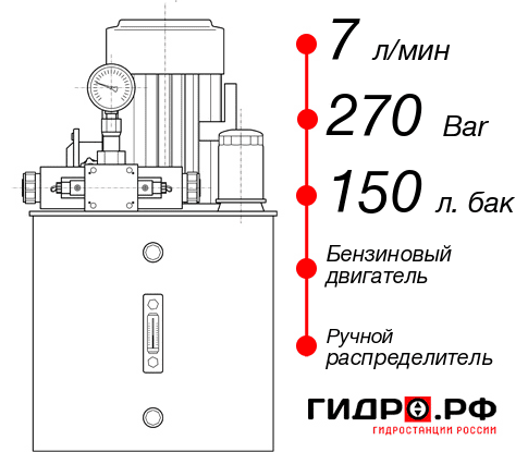 Гидростанция НБР-7И2715Т с гидравлическим контуром 7 л/м и давлением 270 bar. В конструкции используется бензиновый двигатель и масляный бак на 150 литров. Цена с доставкой до производства в Екатеринбурге 181361 руб. Рекомендуемая комплетация: манометр электроконтактный, индикатор расхода, гидравлический замок с гидроуправлением.