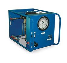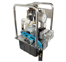 Гидростанция с пневмоприводом служит для обеспечения работы гидропривода цехового оборудования при наличии централизованной пневмомагистрали. Применяются пневматические двигатели мощностью до 7кВт. Пневмопривод обеспечивает высокую надежность работы, имеет меньшую массу по сравнению с электроприводом, но главное достоинство это безопасность при работе во взрывоопасной среде нефте-химических предприятий, газовых месторождений и шахт опасных по газу и пыли. Регулирование подачи насоса гидростанции достаточно легко реализуется изменением подачи сжатого воздуха в пневмомотор. Характеристики потока: до 55л/мин, до 700бар.